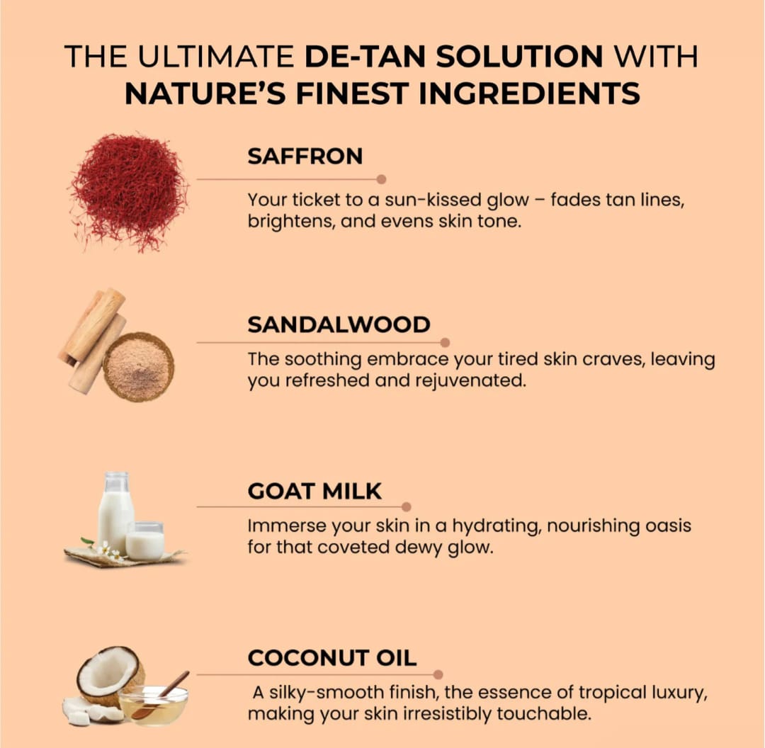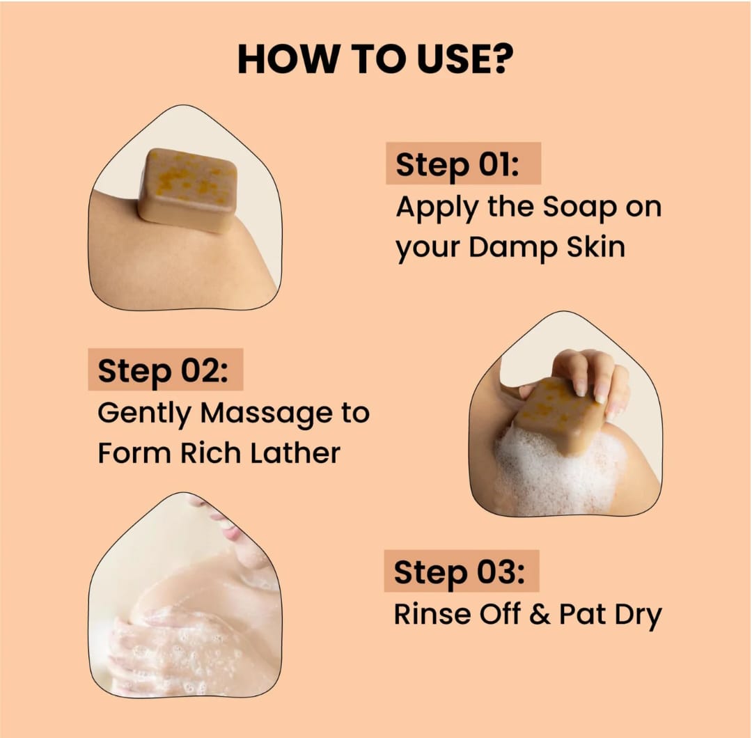 Saffron present in the soap makes the skin brighter. Saffron helps in deeply exfoliating the pores giving you a cleansed, fresh and flawless skin. Scars, sun spots, dark patches and blemishes fades quickly.